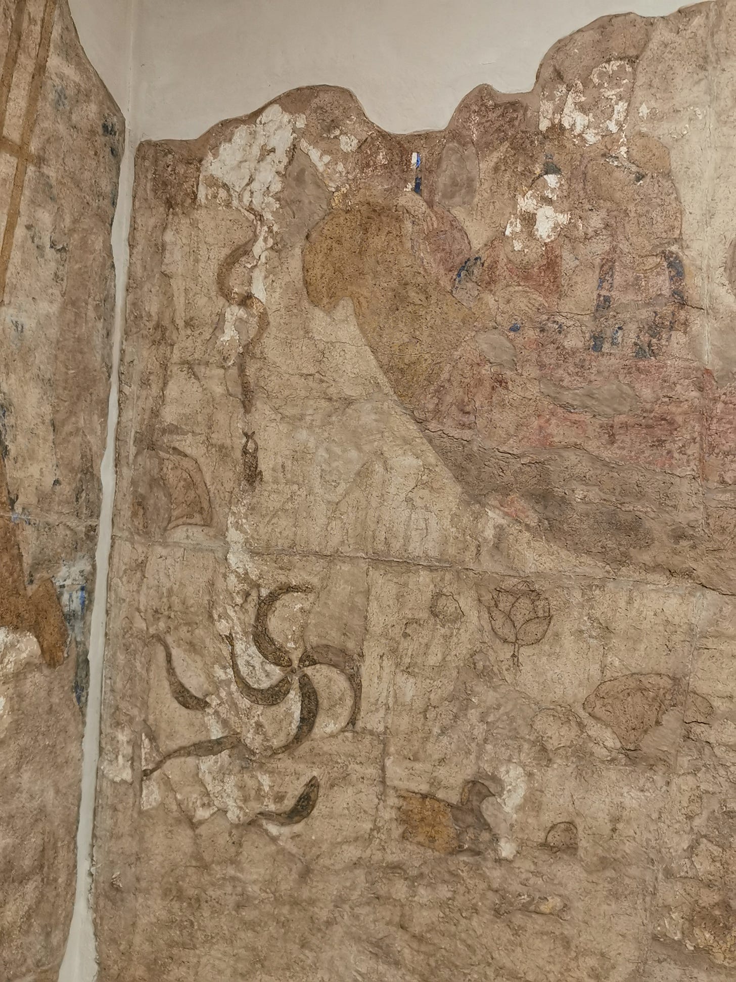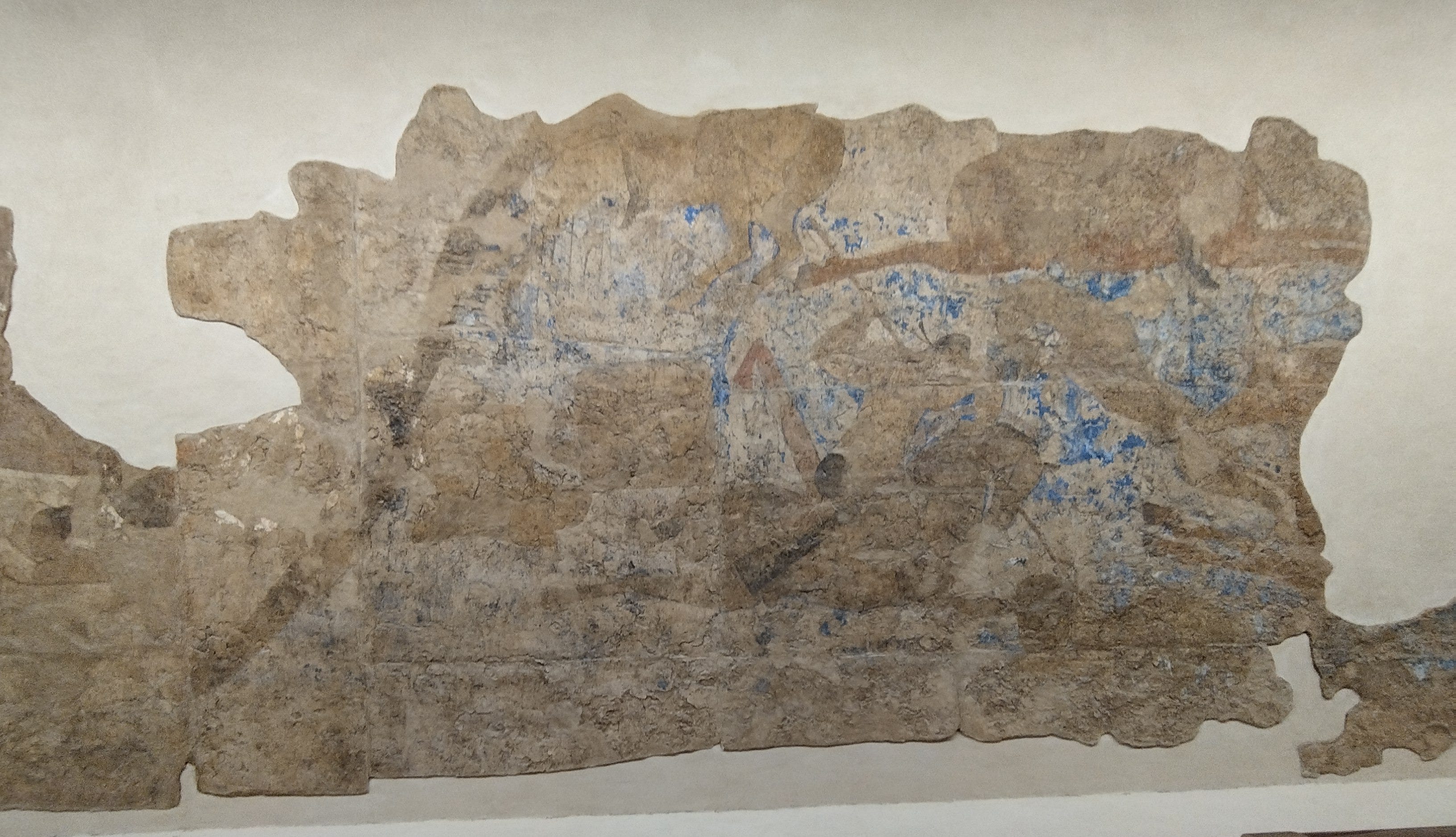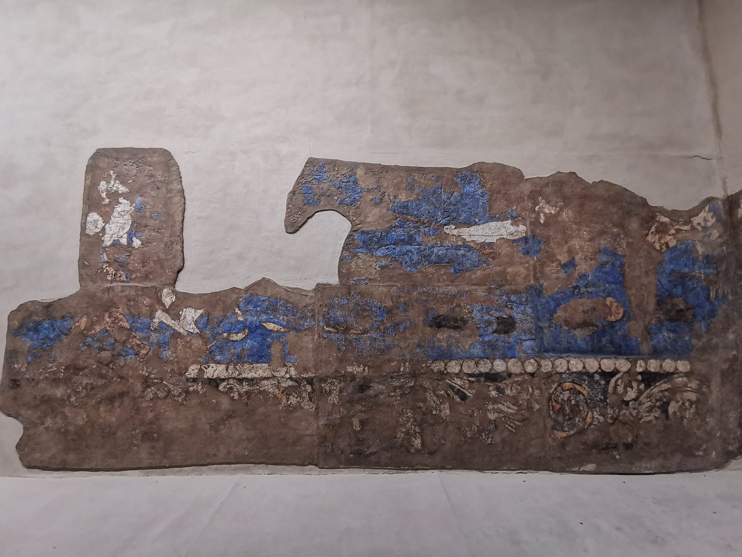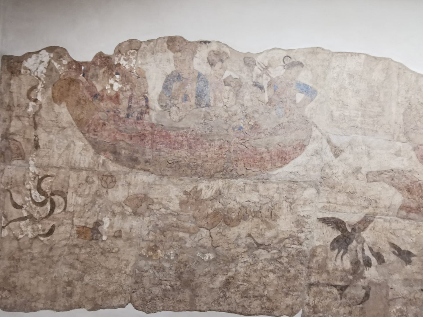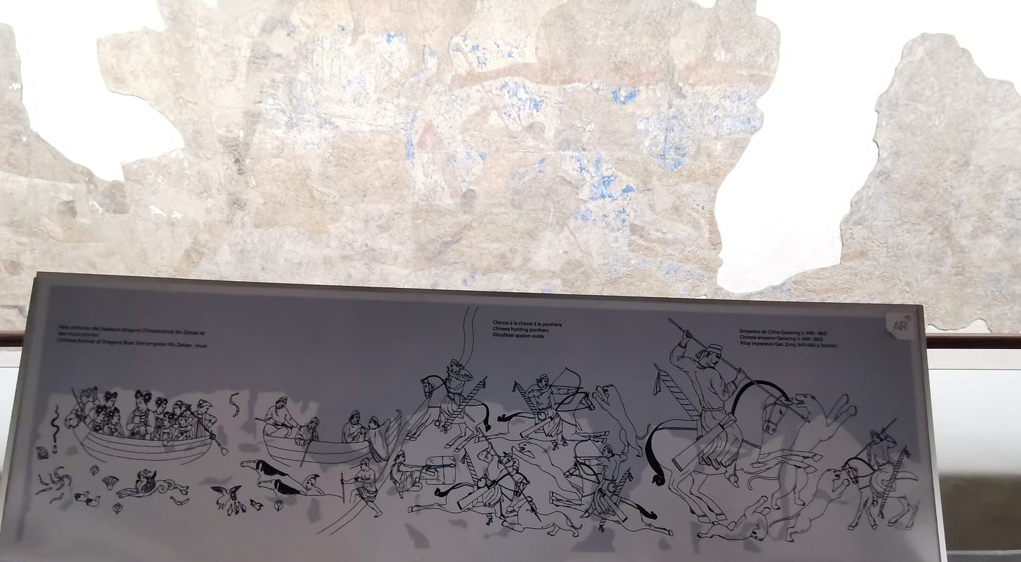 Going on you find a figure on horseback… The Eastern Wall is sadly the most damaged one. Almost illegible or lost. Yet, on the east-south corner - exactly the direction the Procession of the Sogdian Court is heading to - at the back of the Ancestors’ Shrine Pavilion, another aquatic landscape is shone.