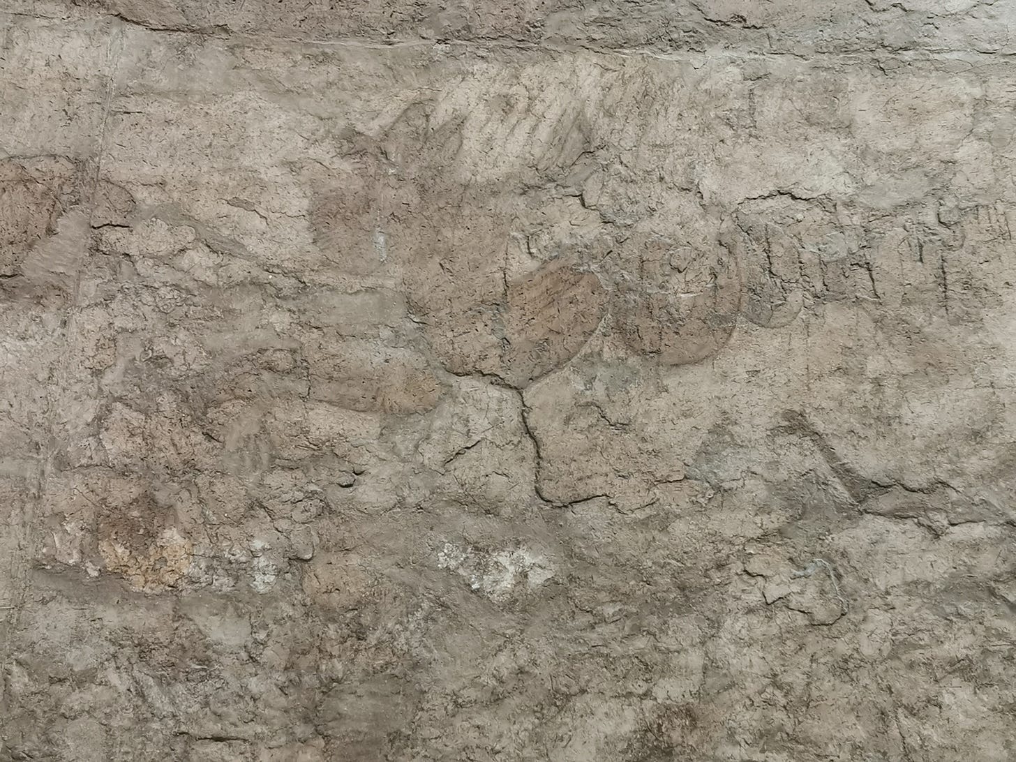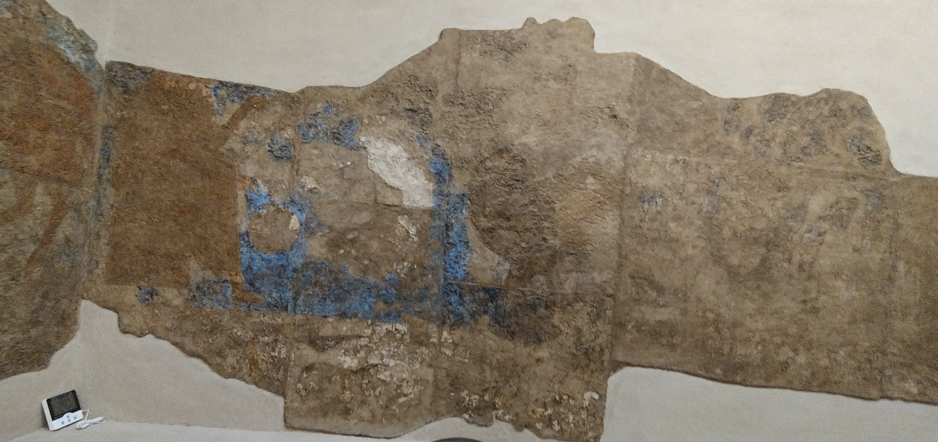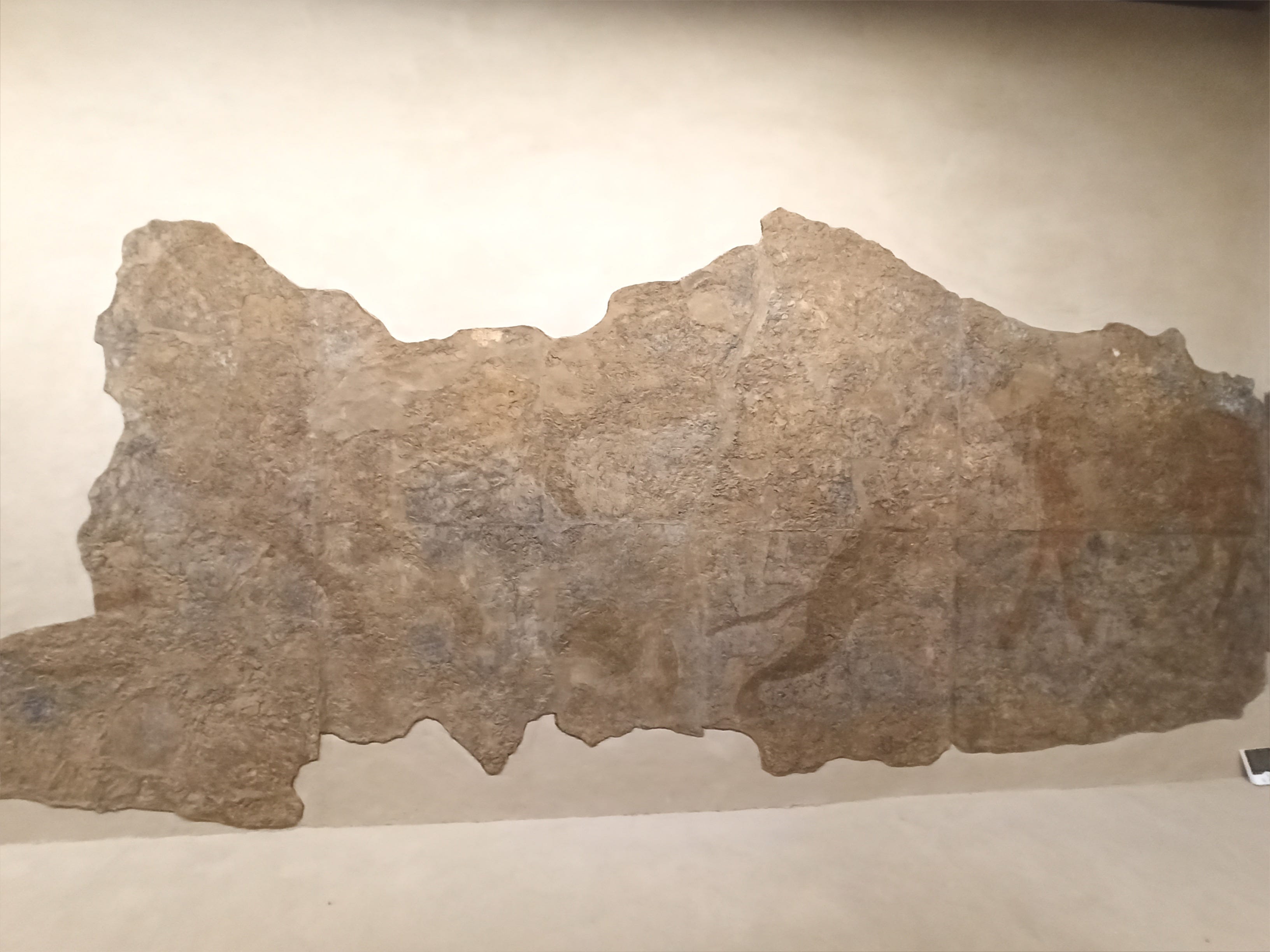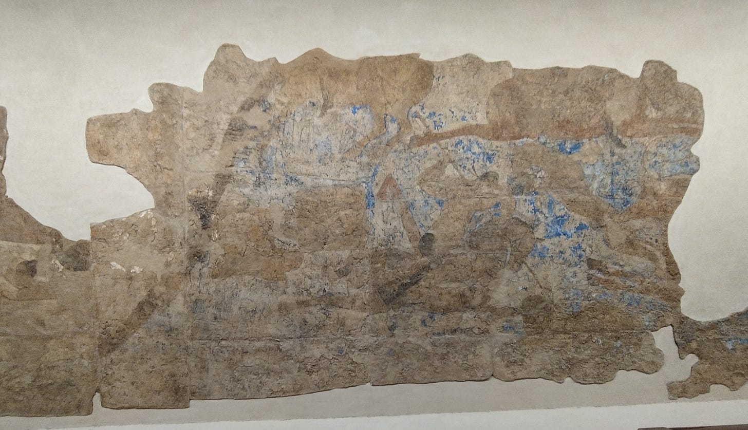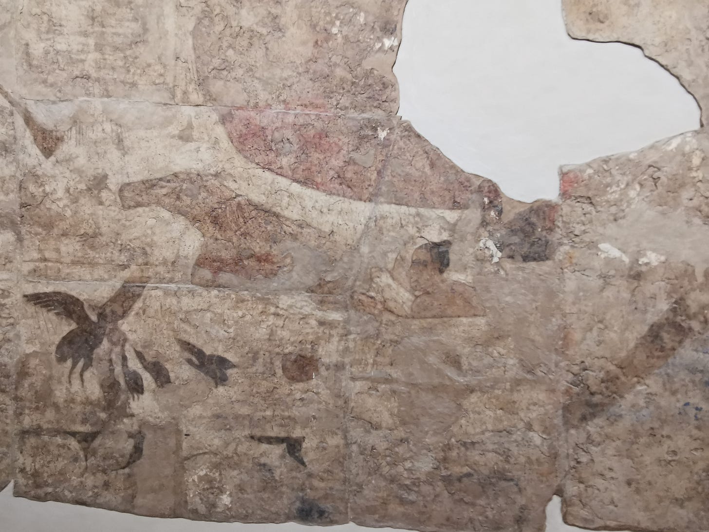Going on you find a figure on horseback… The Eastern Wall is sadly the most damaged one. Almost illegible or lost. Yet, on the east-south corner - exactly the direction the Procession of the Sogdian Court is heading to - at the back of the Ancestors’ Shrine Pavilion, another aquatic landscape is shone.